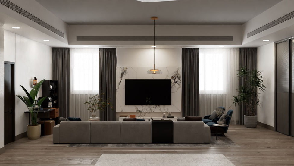The design is defined by a balanced palette of neutral tones, warm wood finishes, and refined materials, creating a calm and inviting atmosphere. Open-plan living areas are thoughtfully connected, while custom furniture, integrated storage, and layered lighting enhance both functionality and visual harmony. The overall concept focuses on comfort, elegance, and a seamless flow between spaces, resulting in a modern and well-composed living environment.