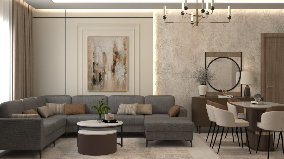 This modern residential interior is designed around comfort and understated elegance. Neutral color palettes, warm wood finishes, and soft layered lighting come together to create a calm and inviting atmosphere.